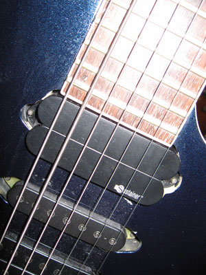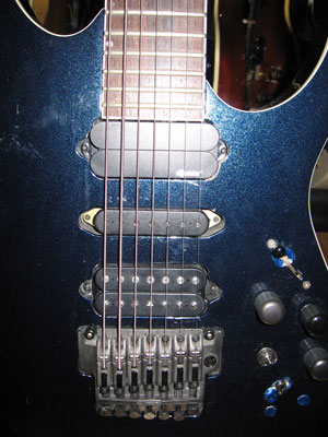 New addition to the super low-7 is this RG2077XL but this one got Fernandes sustainer on it. I took it out of Fernandes Revolver 7 and tosse it in the RG, THis RG was moded originally with preamp so had enough space to install this sustainer. Because of the work previous owner did there are number of holes and stuff but that's ok it's just cosmetics. Also got Dimarzio ToneZone 7 on the bridge with coil tap option. Because I can lock down the string with this one this got better intonation than the original super low-7.